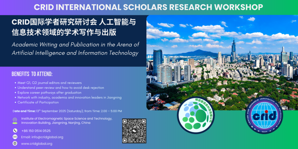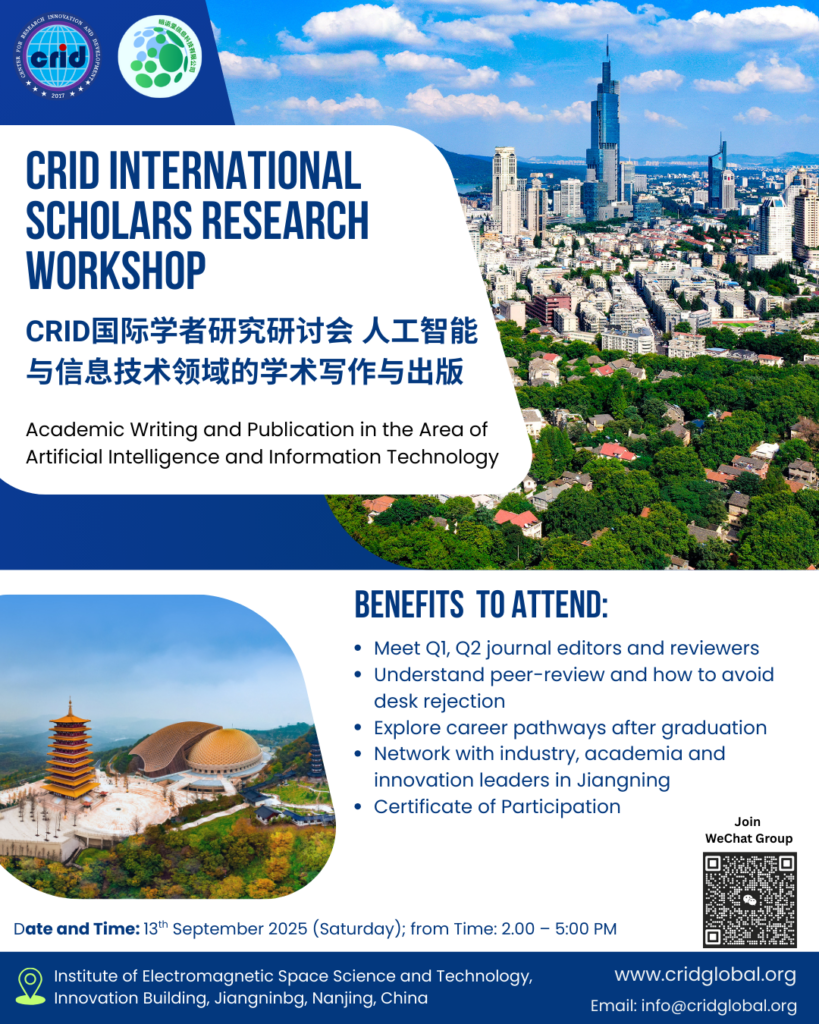 On 13 September 2025, the Center for Research Innovation and Development (CRID) convened a landmark International Scholars Research Workshop at the Institute of Electromagnetic Space Science and Technology, Innovation Building, Jiangning, Nanjing, China. Over three hours, the event gathered senior academics, early-career researchers, industry professionals, and innovation leaders from China and abroad to exchange ideas and practical skills for advancing research quality and impact.