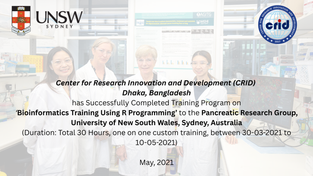 The Bio Informatics Research Lab of the Center for Research Innovation and Development (CRID), Dhaka, Bangladesh successfully completed a specialized training program titled Bioinformatics Training Using R Programming for the Pancreatic Research Group, University of New South Wales (UNSW), Sydney, Australia. Conducted between 30 March 2021 and 10 May 2021, the program delivered a total of 30 hours of intensive, customized one-on-one training focused on practical bioinformatics data analysis skills using R, with emphasis on research applications relevant to cancer and genomic studies. This capacity-building initiative strengthened analytical competence, enhanced research efficiency, and contributed to advancing high-quality biomedical research collaboration between CRID and UNSW. (May 2021)