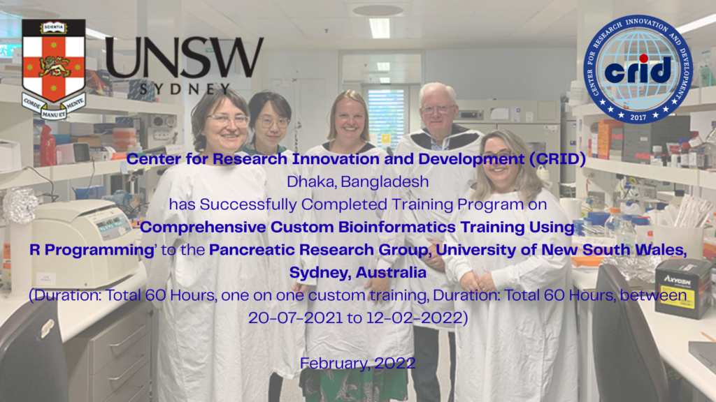 The Bio Informatics Research Lab of the Center for Research Innovation and Development (CRID), Dhaka, Bangladesh successfully completed a specialized program titled Comprehensive Custom Bioinformatics Training Using R Programming for the Pancreatic Research Group, University of New South Wales (UNSW), Sydney, Australia. Delivered as an intensive, personalized one-on-one training between 20 July 2021 and 12 February 2022, the program covered a total of 60 hours of structured learning focused on advanced bioinformatics techniques, R-based analytical skills, and research-oriented data interpretation. This initiative significantly enhanced the group’s capacity for high-impact biomedical and cancer research while strengthening international research collaboration between CRID and UNSW. (February 2022)