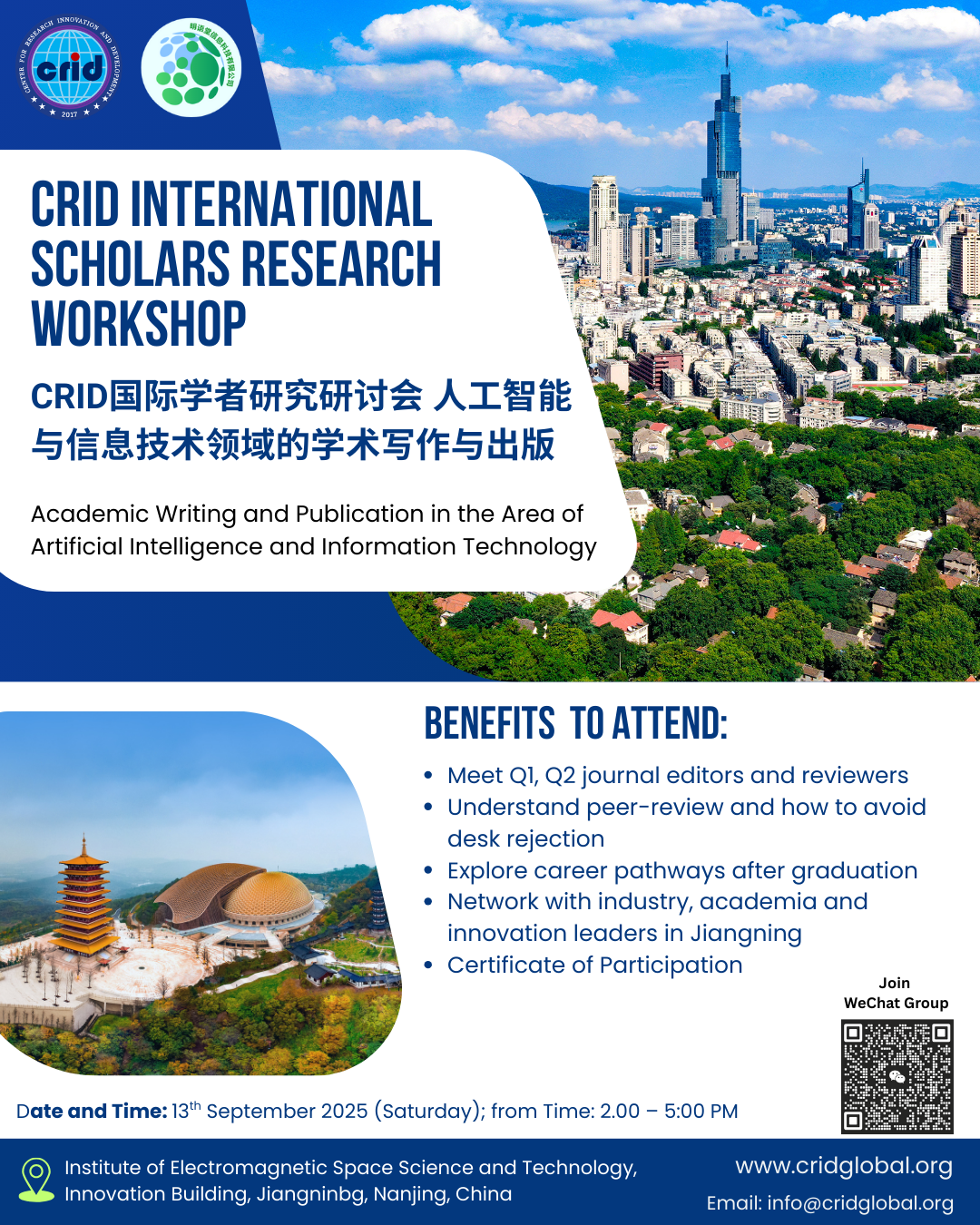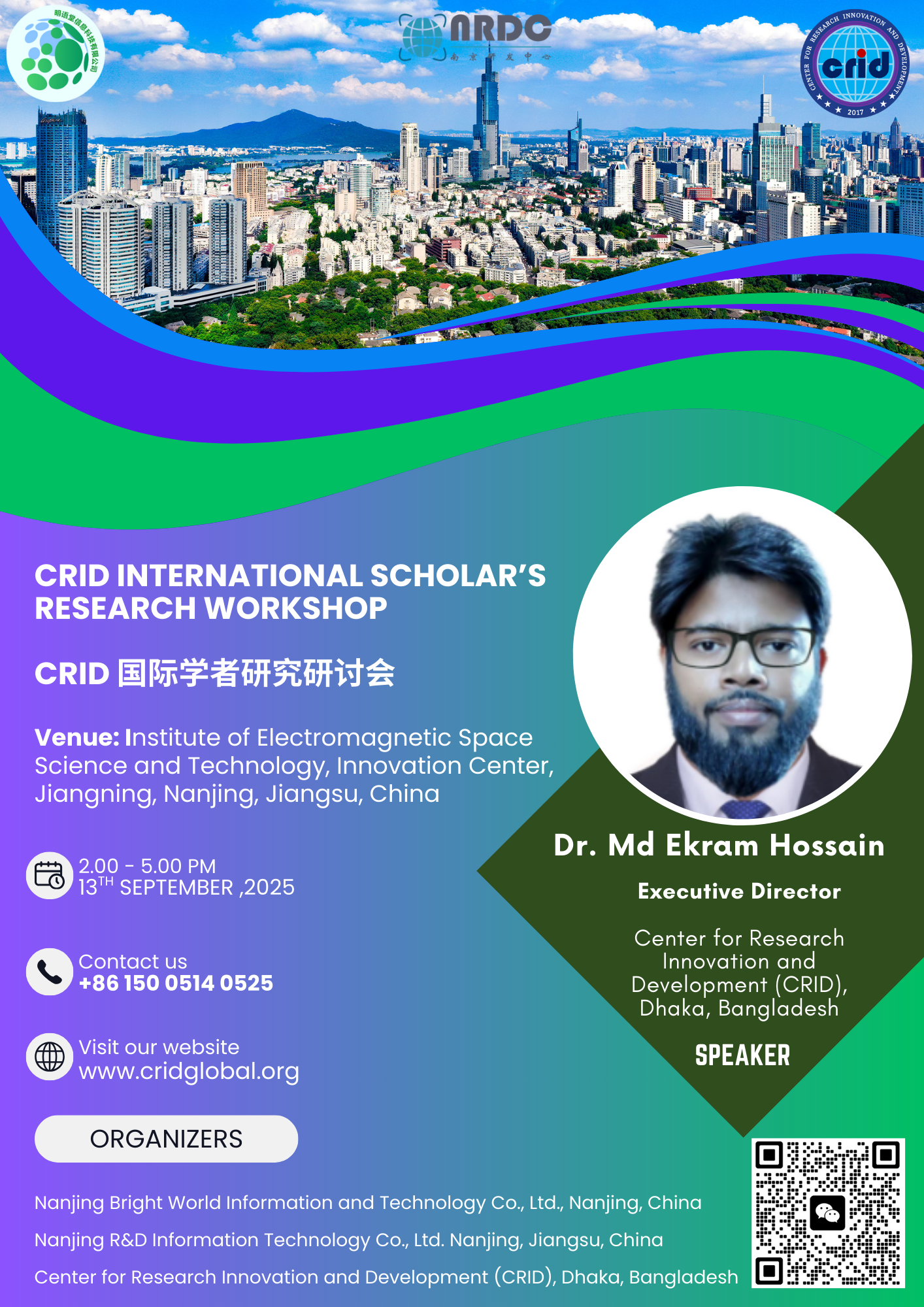On 13 September 2025, Dr. Md Ekram Hossain, Executive Director and Senior Research Fellow of the Center for Research Innovation and Development (CRID), participated as one of the key speakers at the CRID International Scholars Research Workshop (CRID国际学者研究研讨会) held at the Institute of Electromagnetic Space Science and Technology, Innovation Building, Jiangning, Nanjing, China.