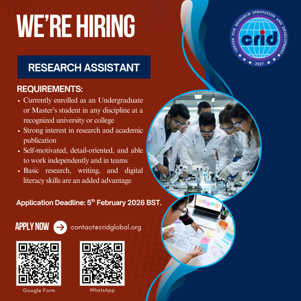 As a Research Assistant at Center for Research Innovation and Development – CRID in Dhaka, you will have the chance to contribute to cutting-edge research projects, collaborate with faculties and researchers in Bangladesh and abroad, and gain valuable insights into your field of interest. The role is designed to provide hands-on experience, enhance your research skills, and prepare you for postgraduate studies in international institutions.